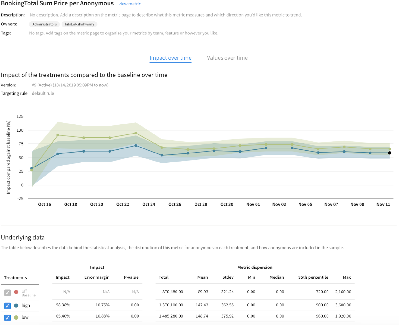 - Review the aggregated metric value for all treatments in the Values over time chart