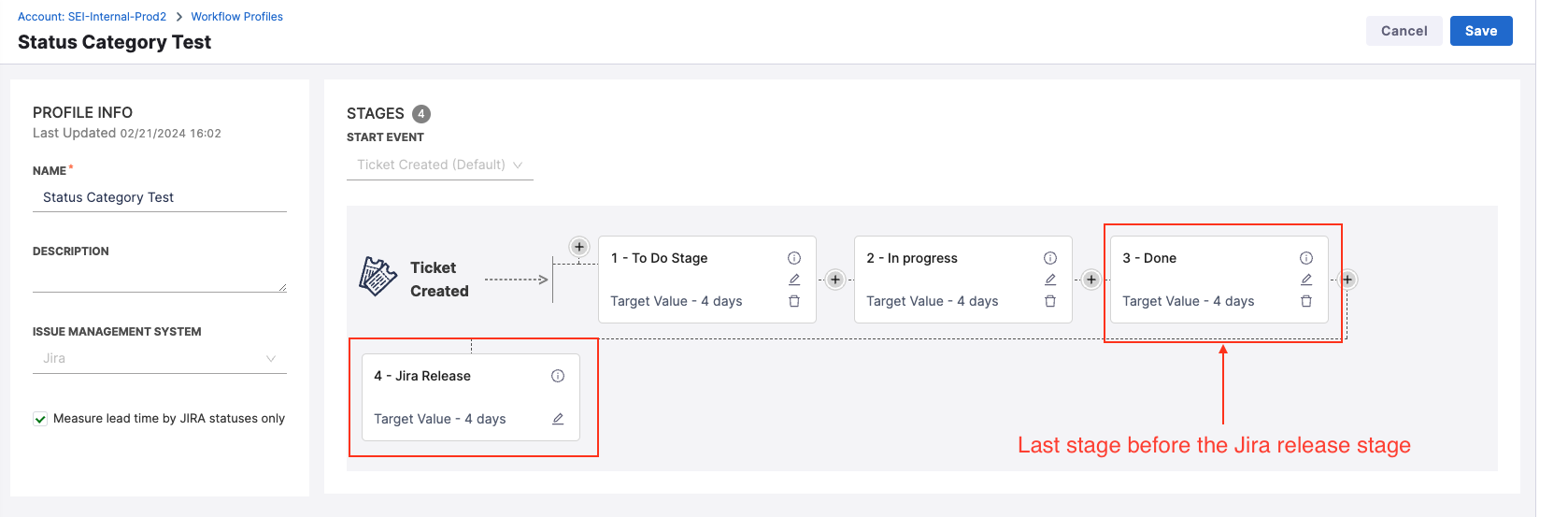 - For new profiles, the release stage is disabled by default. Enable it by selecting the checkbox to measure lead time using Jira statuses.